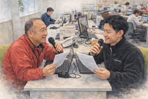 ラジオMC風によるAI朝礼の進行風景