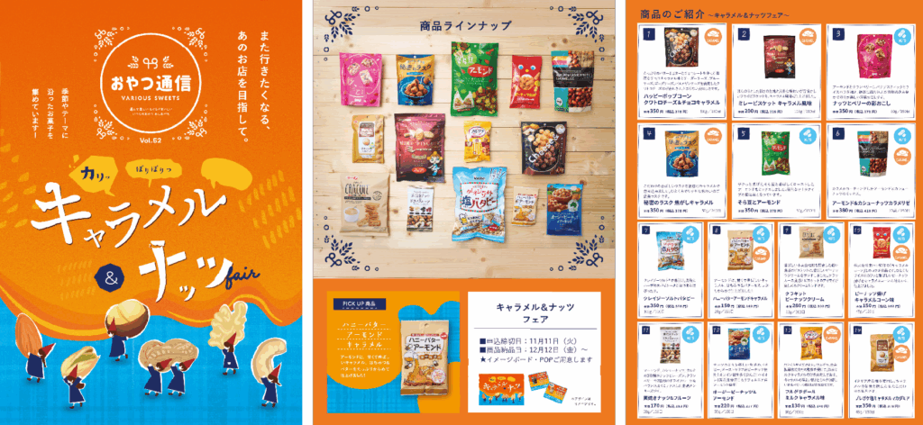 四季に応じて、売り場のイメージを簡単に変えることが出来たら。人気のテーマにそった商品を集めた売り場が手軽につくれたら。そんなご要望の中でうまれたおやつ通信。年8回ほど季節ごとにフェアテーマが決まっており、弊社のバイヤーが商品を集め、その中から実際に食べてみて美味しかったものだけを選定し、商品ラインナップを決めています。